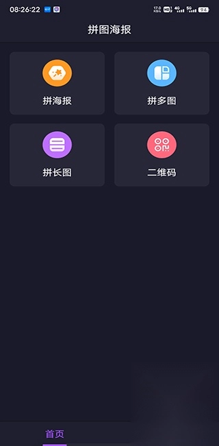 1、打开拼图海报,进入后能看到【拼海报】、【拼多图】、【拼长图】和【二维码】这四种功能;