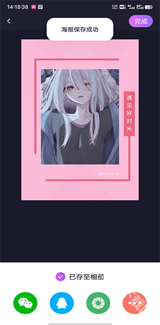 5、所有修改操作完成后,点击【保存】按钮就能将内容保存到相册,而且还支持一键分享至微信、QQ等社交平台。