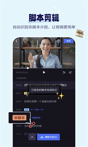 2、快速剪辑功能:能够一键识别视频里的无声、重复和语气类片段,用户仅需对照文本,即可完成视频剪辑并添加字幕。