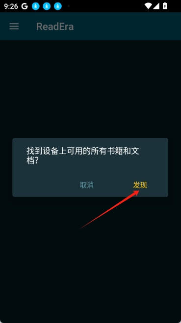 1. 启动ReadEra后,默认会弹出“是否要查找设备上所有可用的书籍和文档?”的提示,点击“发现”按钮就能自动识别目录。