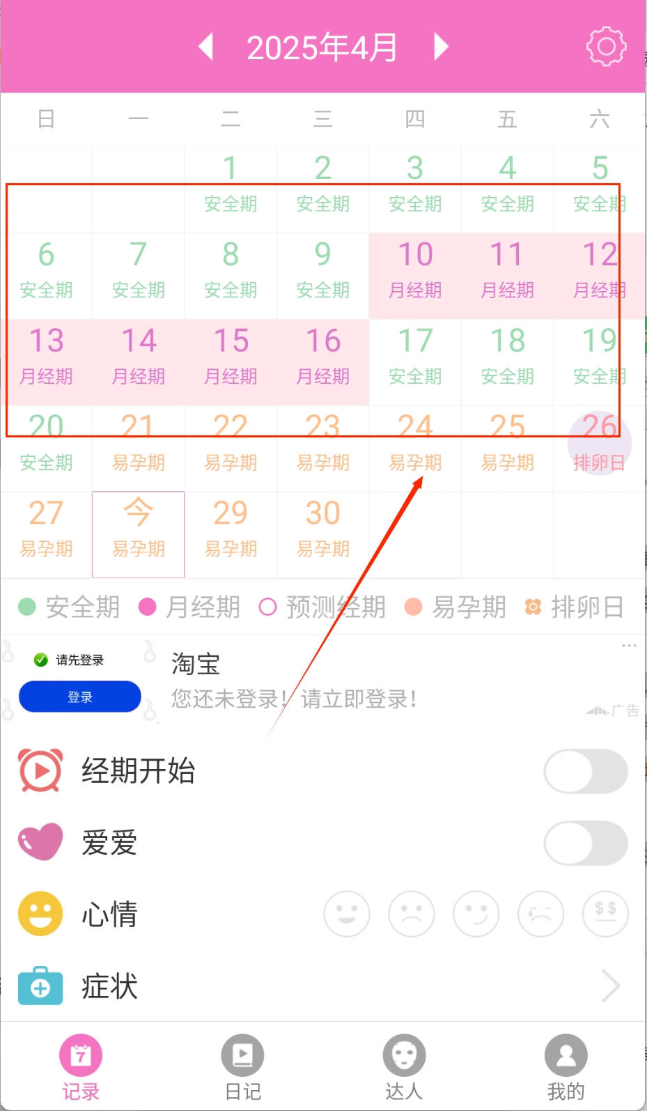 1、滑动查看日历页面,不同颜色标注排卵期和安全期,点击日期可查看详情或手动调整周期数据。