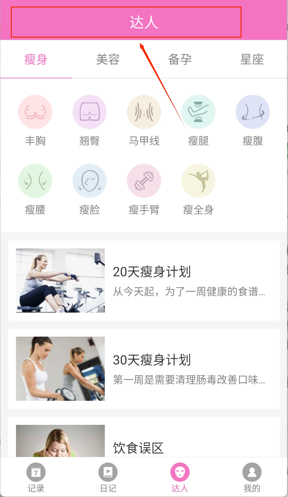 3、进入达人板块,可以查看瘦身、美容等内容。