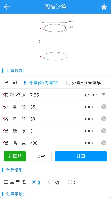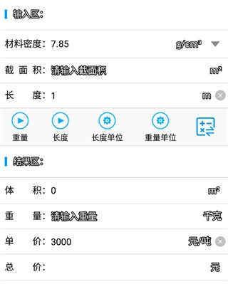 4. 输入材料的密度、长度、单价等参数后,系统会自动完成相关计算。