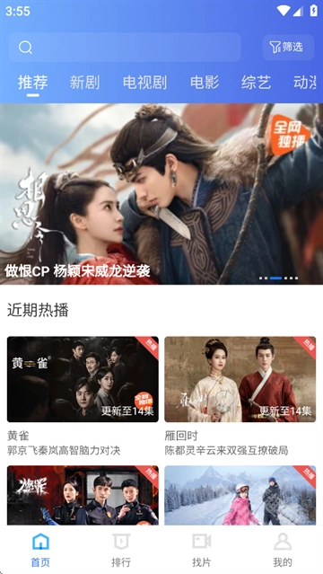 1. 在抢先视频的首页,能看到推荐、新剧、电视剧、电影、综艺、近期热播等分类以及相关推荐内容。