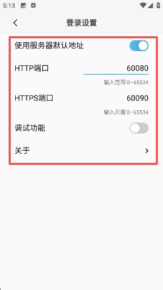 2、在登录设置页面,你可以选择是否开启“使用服务器默认地址”选项,也能对HTTP/HTTPS端口进行修改,还可以开启调试功能等;完成这些配置操作后,就能回到登录界面了。