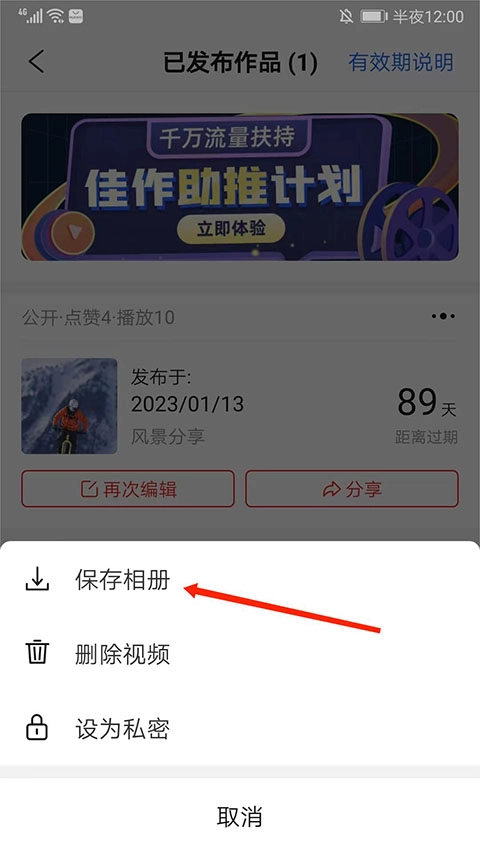 4、弹出“保存至相册”“删除视频”“设为私密”的提示选项,选择“保存至相册”