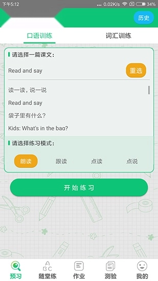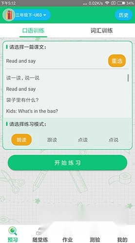 1、口语训练:依托课文短语开展口语发音学习,并配备发音评分功能。